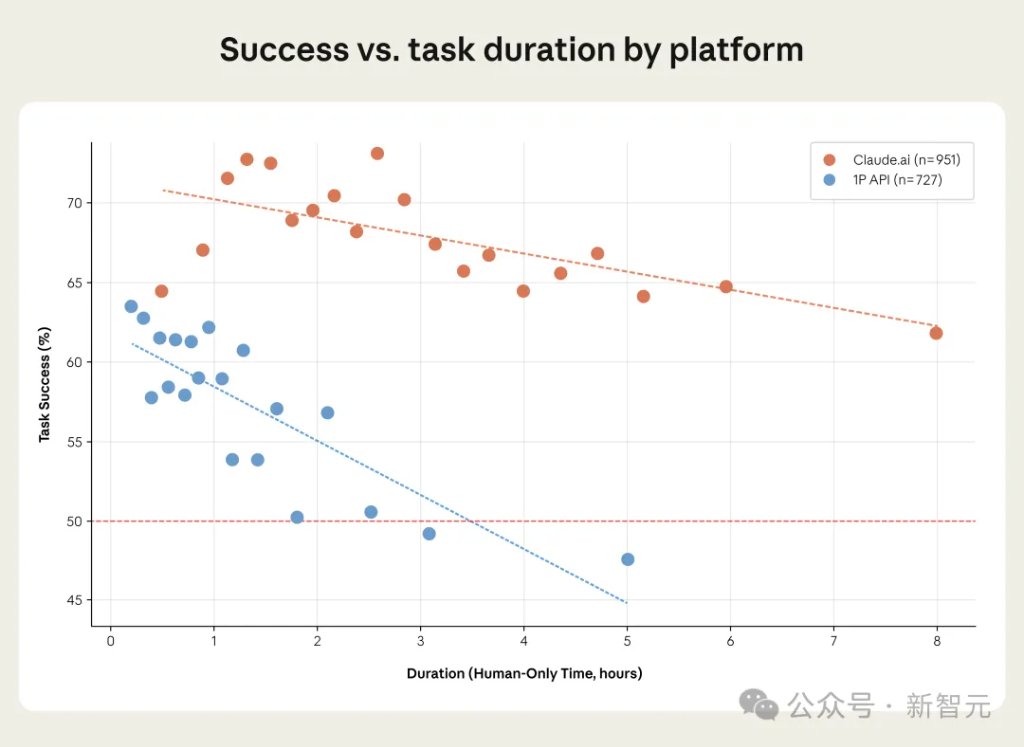 但在 Anthropic 的实际用户数据中,这个时间界限被显著拉长了。