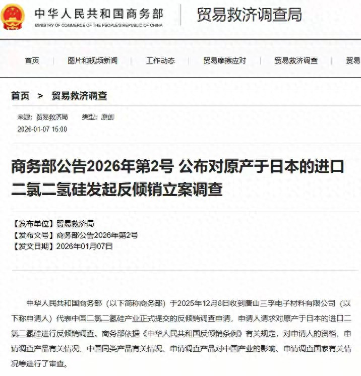 就在日方抗议声未歇之际,1月7日商务部第2号公告接踵而至,宣布对原产于日本的进口二氯二氢硅发起反倾销立案调查。这一精准打击牛8速配,戳中了日本半导体产业的优势领域,更彰显了中国产业链自主化的坚定决心。